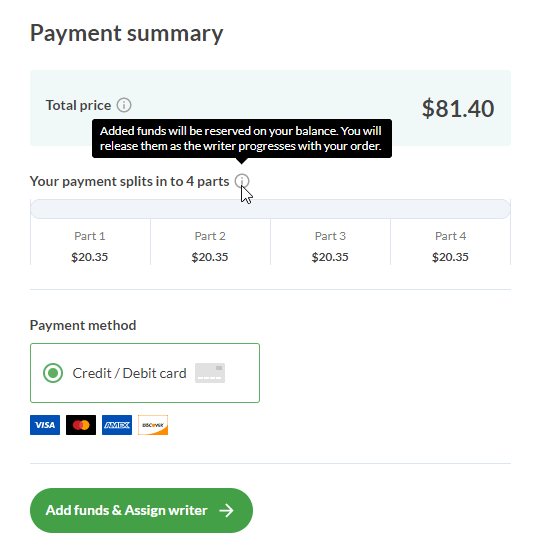 The only payment option available is via credit or debit card. However, the funds are stored on your balance and released to the writer in four parts after you approve them. I believe this is supposed to alleviate anxiety, though it seems tedious and unnecessary.