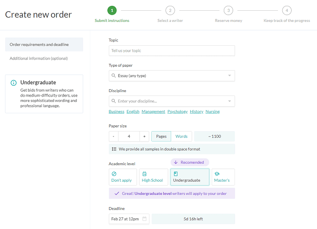 Although the writers’ profiles seem impressively detailed at first glance, they are devoid of useful information. Aside from stats and reviews, I got no credentials, qualifications, or writing samples. So I chose to skip the bidding step and went with the Writer Finder option that assigned the writer automatically.
